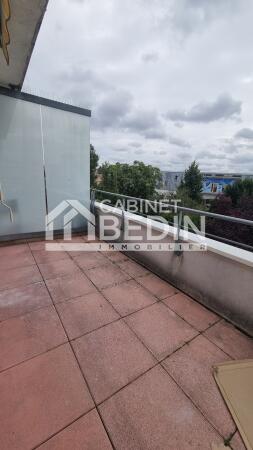T2 Avec terrasse et parking au pied du tram B "bergonié". Résidence sécurisée avec ascenseur. L'appartement donne sur l'arrière(calme) Entrée avec placard, séjour avec kitchenette équipée plaques frigo hotte, chambre avec placard, salle de bains/wc et cellier. Tres bon état general.
