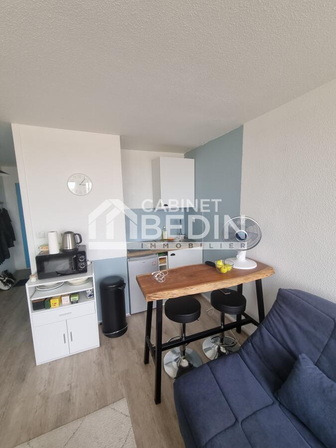 Agreable studio meuble, situé rue cite mouneyra, au 5eme et dernier etage avec ascenceur. Il se compose d'une entrée avec placard, une salle de bains avec wc et machine à laver. Piece de vie avec balconet, vue dégagée, canapé convertible, un bureau, cuisine équipée (frigo, plaque,micro-onde) table bar, Pour completer le tout garage à vélo Libre au 3 juin