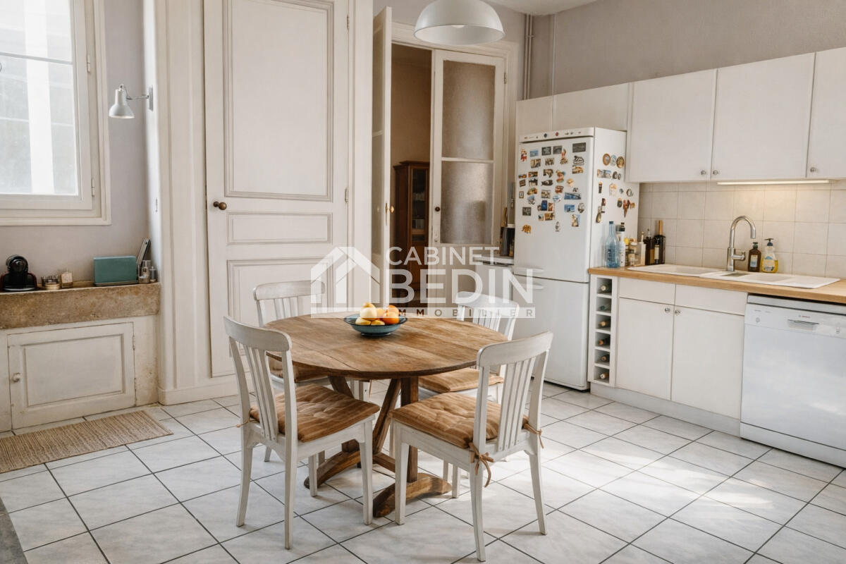 L’appartement conserve tout le charme de l’immobilier bourgeois bordelais avec ses parquets anciens, cheminées et belles hauteurs sous plafond. Les pièces de réception comprennent un salon et une salle à manger en enfilade, créant un espace de vie spacieux et élégant. Une grande cuisine indépendante complète l’ensemble.