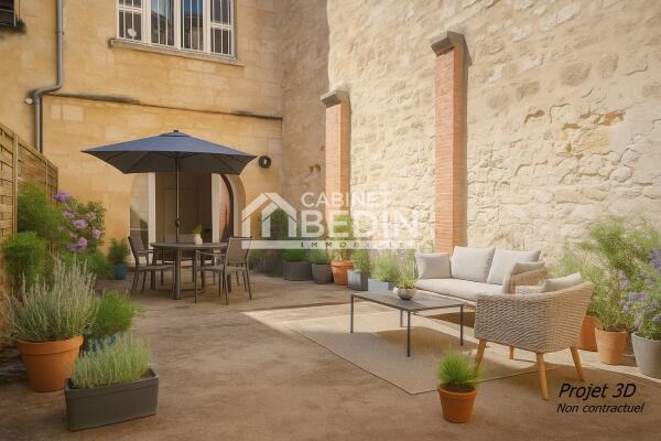 Une cour de 70 m² attenante à la pièce principale, sans vis à vis, fait de ce lieu un cocon unique, au calme absolu dans le beau Bordeaux.
