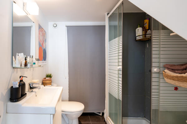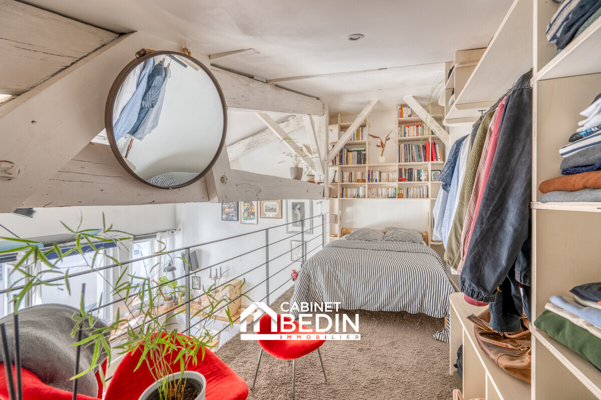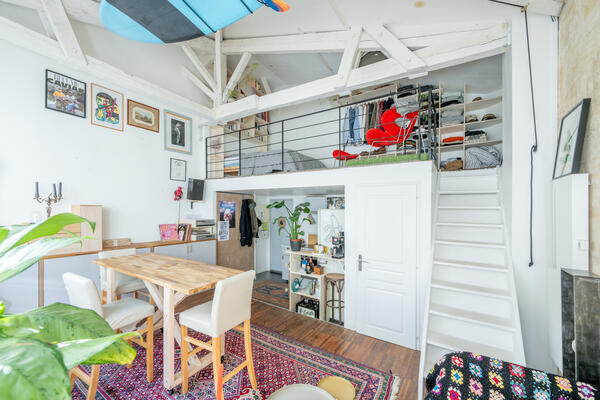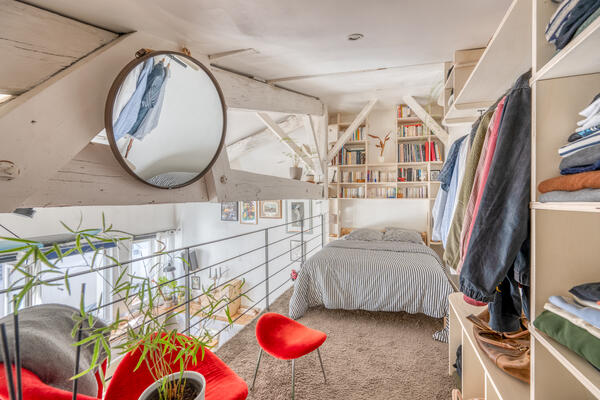 Une chambre en mezzanine confortable (hauteur permettant de se tenir debout), un dressing ainsi qu’une salle d’eau avec WC complètent ce bien.