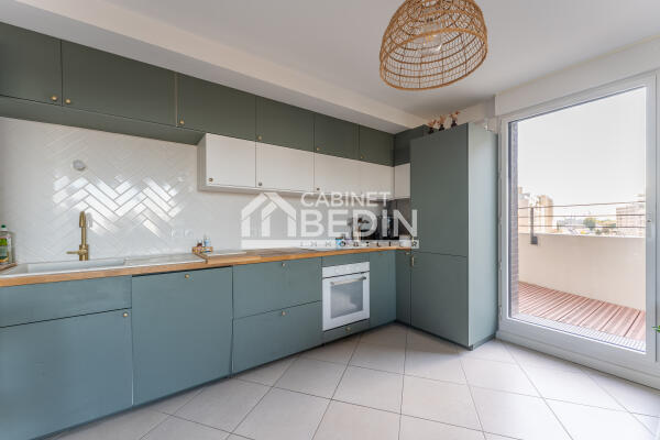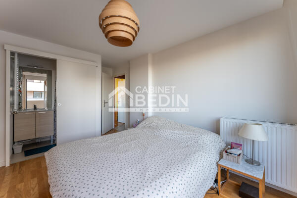 Il se compose de quatre chambres, 2 points d'eau dont une douche et une salle de bains, une cuisine équipée et aménagée ouverte sur le salon, une terrasse et une loggia avec vue sur Bordeaux. Une place de parking vient compléter cette offre.