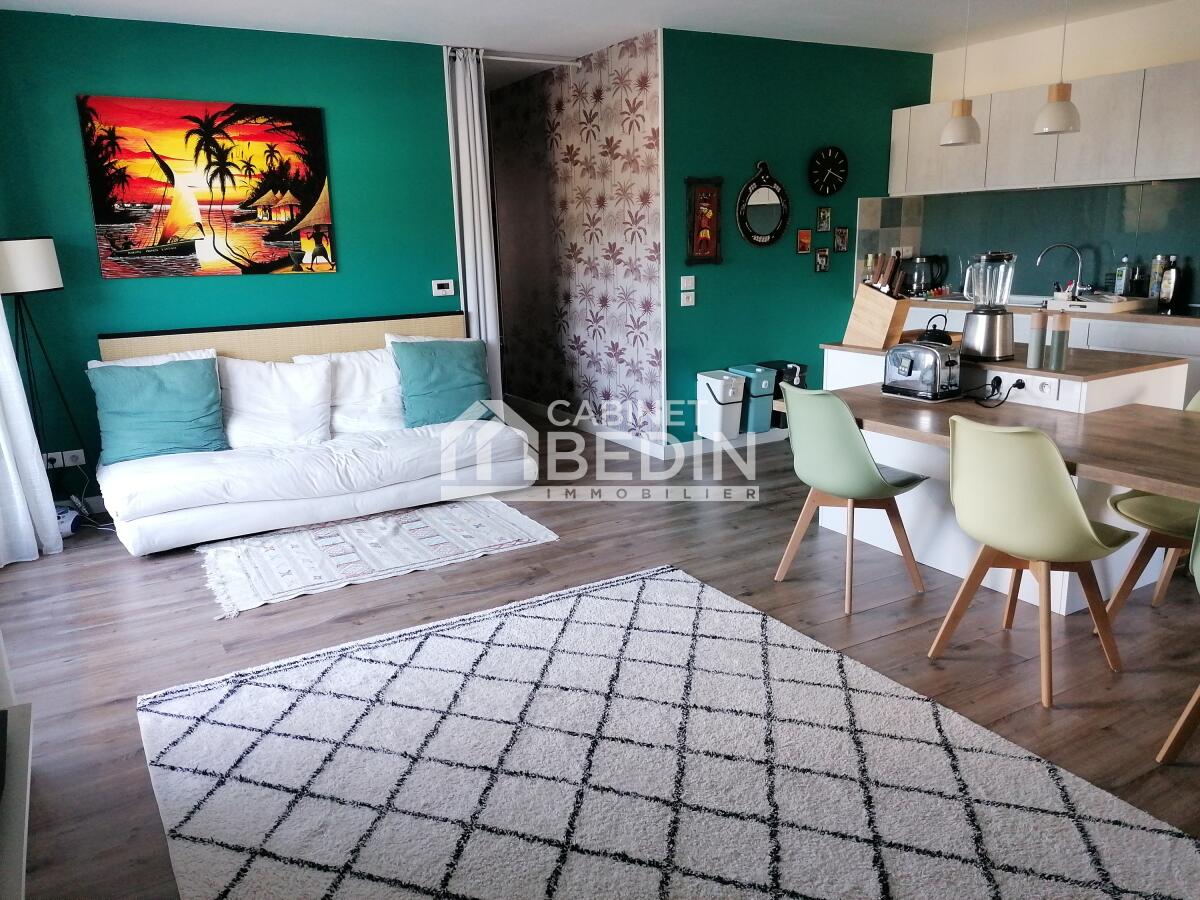 La pièce de vie lumineuse est ouverte sur une cuisine entièrement équipée, créant un espace convivial et moderne.