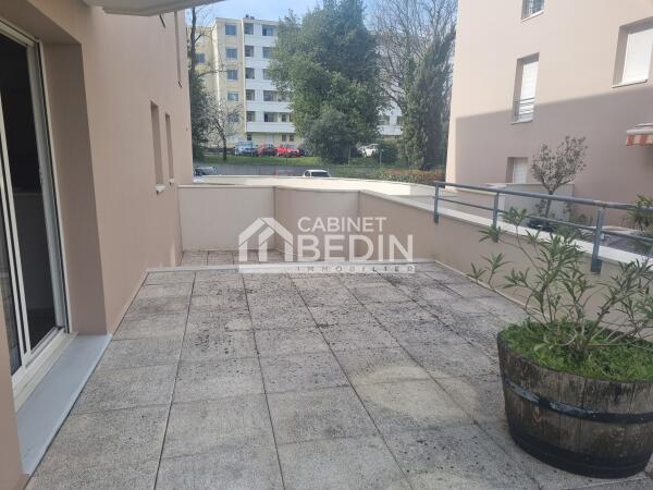 Grand T2 lumineux avec une terrasse d'environ 40m², en bon état donnant sur les jardins, situé dans une résidence de standing, dans un quartier recherché du Bouscat, à deux pas du tram D et des commerces de l'hyper centre, il comprend une entrée, un salon-séjour avec cuisine équipée, une chambre et une salle de bains, wc séparé. Une place de parking complète le bien.