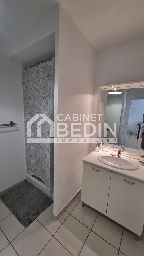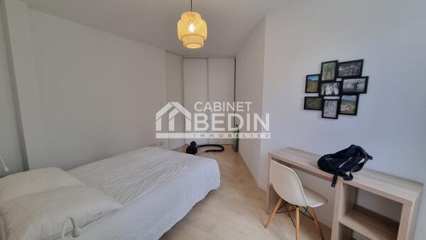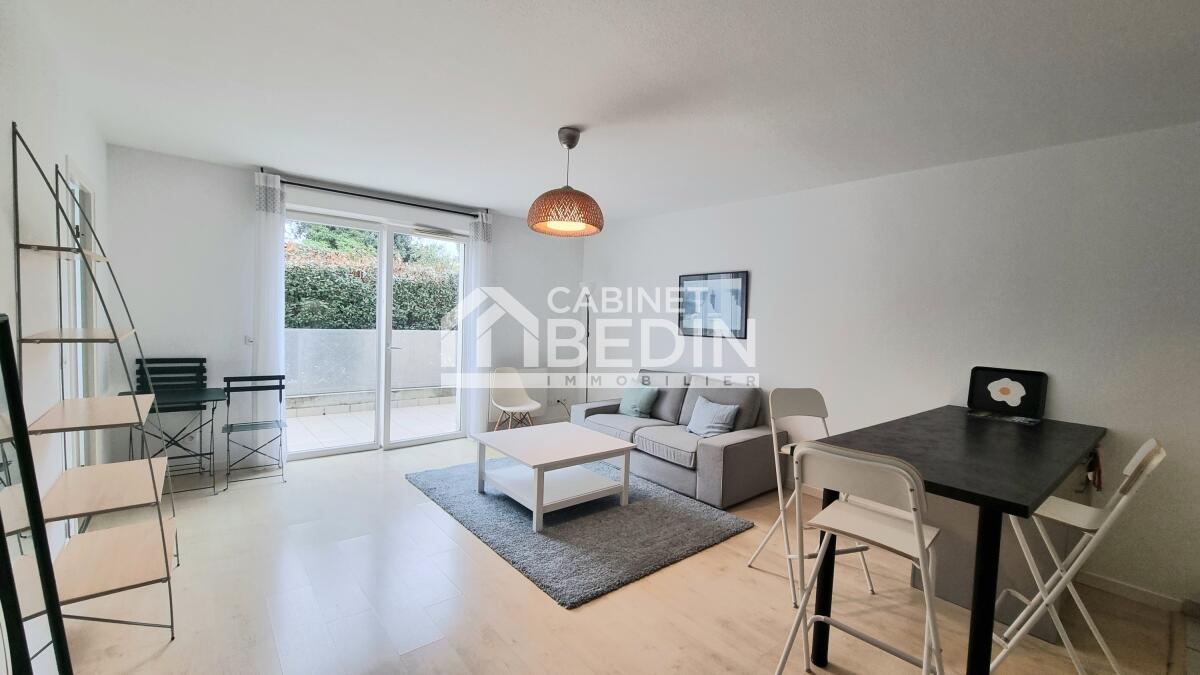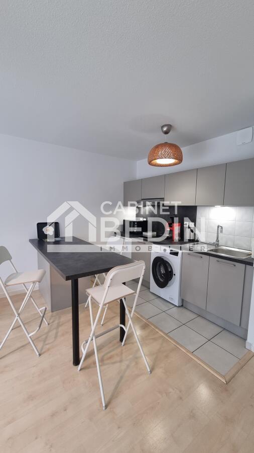 Beau T2 meublé 49m² avec Terrasse et Parking. Grand séjour, cuisine US équipée moderne, chambre avec placard, salle d'eau/ wc. Grande terrasse avec vue dégagée sur la verdure tournée vers l'intérieur de la résidence au calme. Place de parking. Tram A proximité immédiate arret F. Mitterrand. Une visite virtuelle est disponible sur cabinet-bedin.com Visite : prise de rdv sur palto.immo Elodie ARTIGUE 0609775316