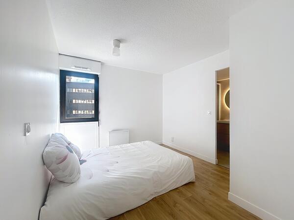Côté nuit, une chambre au calme, avec vue sur le jardin de la copropriété, offre un véritable cocon de tranquillité, complétée par une salle d’eau contemporaine et des WC.