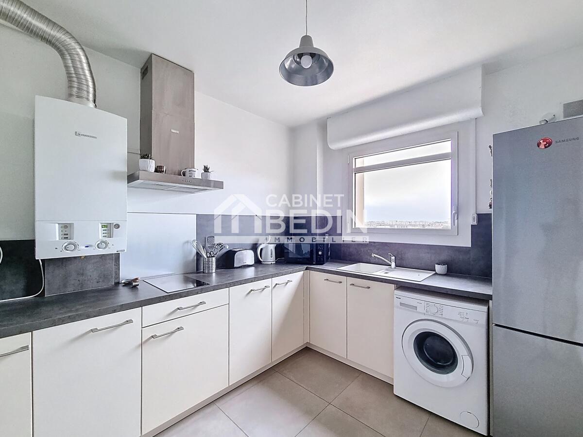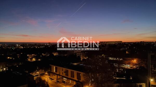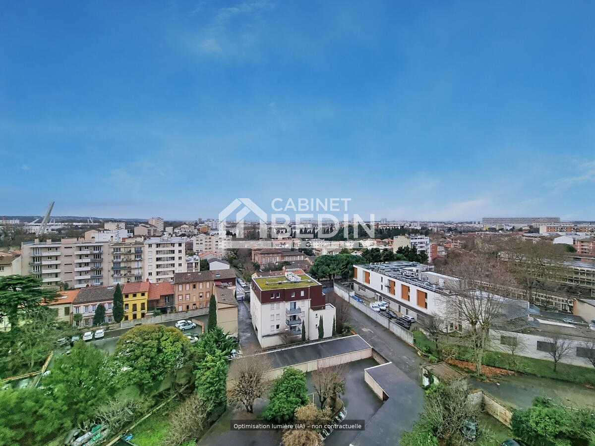 L'appartement est situé au neuvième étage sur 11, possède une cuisine équipée, une grande pièce de vie, une salle d'eau, wc séparé une cave complète le bien et une vue imprenable sur la ville rose.