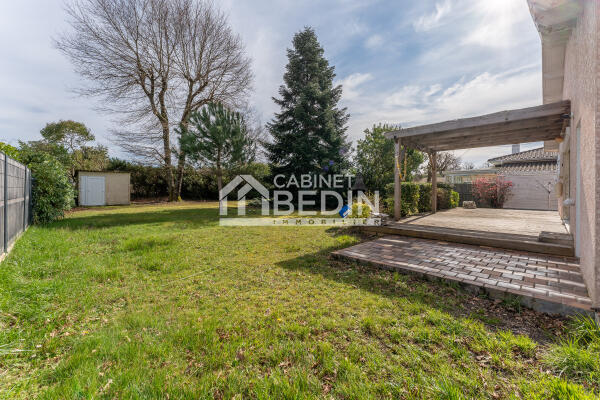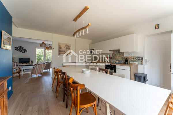 Maison de plain pied esprit bassin rénovée par architecte comprenant trois chambres dont chambre parentale avec salle d'eau attenante avec wc, salle à manger sur cuisine us, salon, dégagement, cellier, salle d'eau, wc. Abri de jardin. Belle parcelle arborée et piscinable de plus de 920 m². A visiter sans tarder.