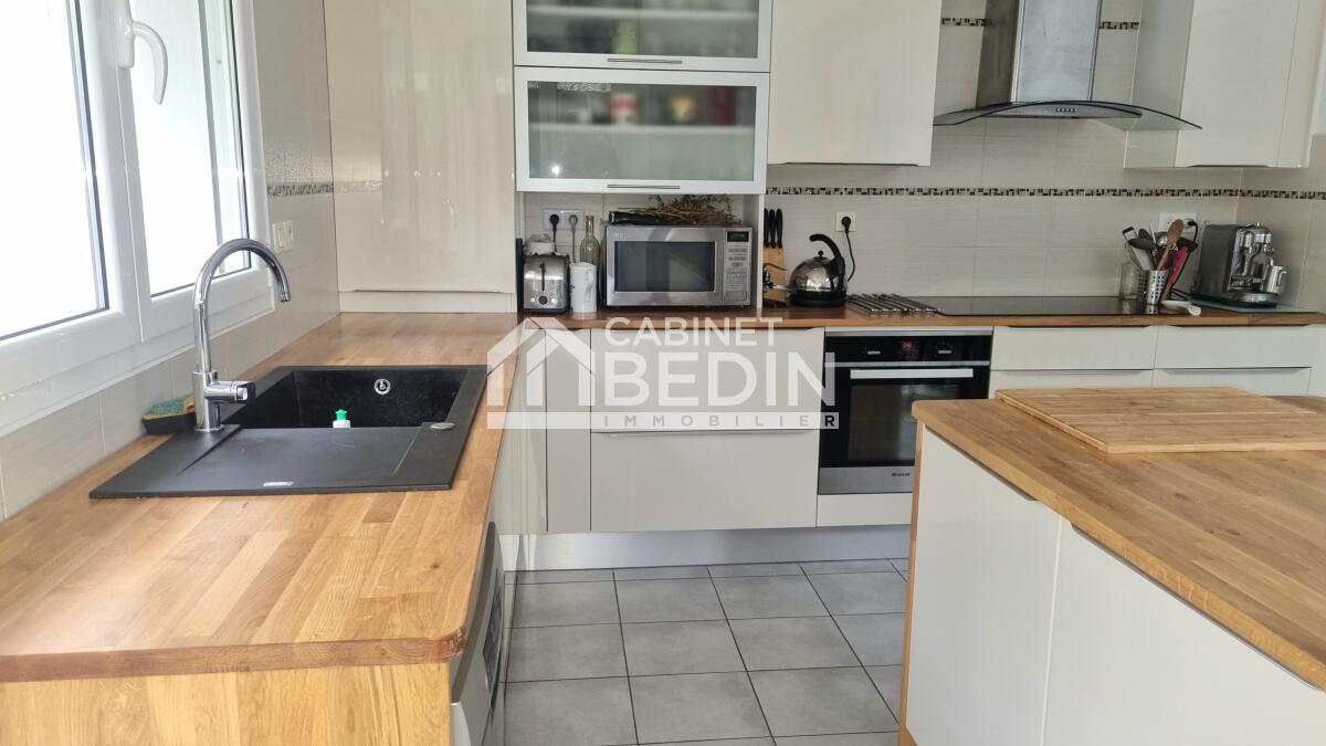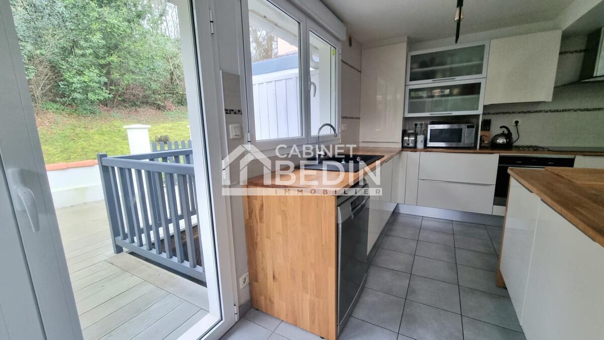 Au rez-de-chaussée, la pièce de vie spacieuse et lumineuse réunit salon et cuisine ouverte dans une ambiance conviviale. Elle s’ouvre sur une terrasse en hauteur avec vue sur les arbres, idéale pour profiter d’un moment de détente en toute tranquillité.