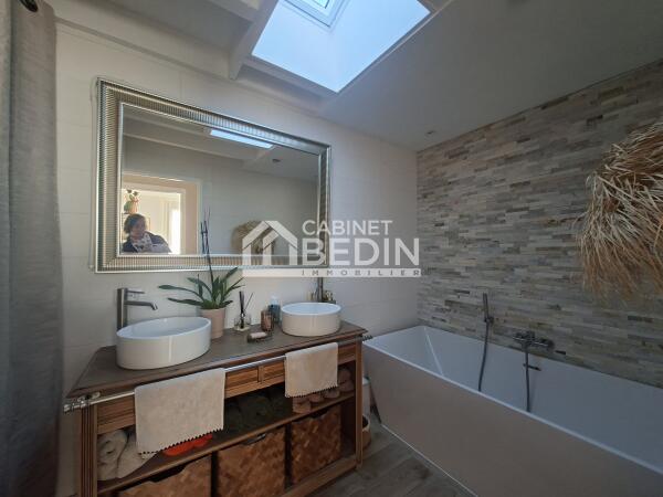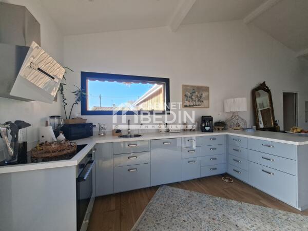 Cette maison lumineuse séduit dès l’entrée par son superbe séjour cathédrale baigné de lumière naturelle, offrant de beaux volumes et une atmosphère chaleureuse. La cuisine moderne, aménagée et entièrement équipée, s’ouvre harmonieusement sur l’espace de vie, idéal pour recevoir.