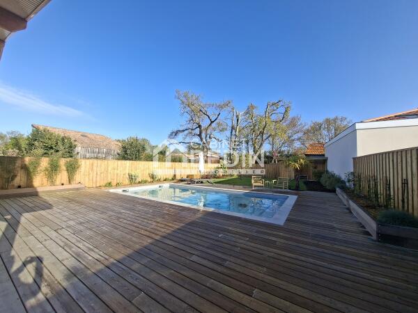 À l’extérieur, vous profiterez d’une agréable terrasse couverte prolongée par une piscine, le tout sublimé par une élégante terrasse en bois.