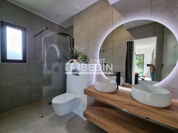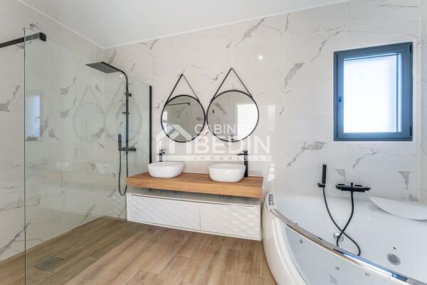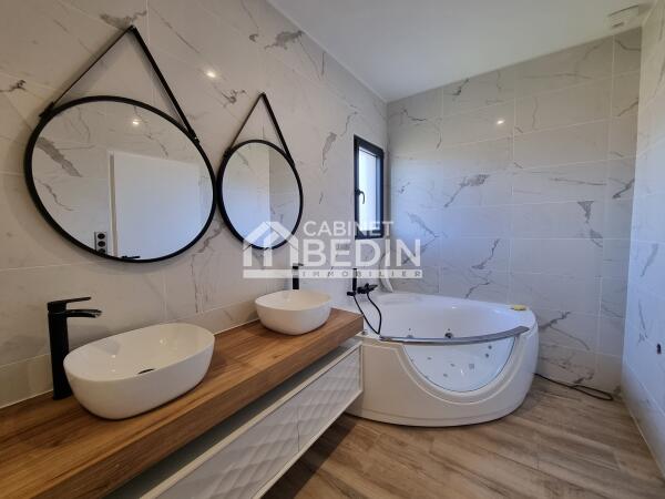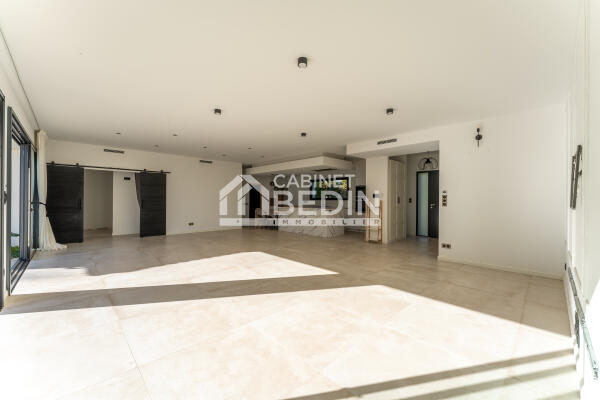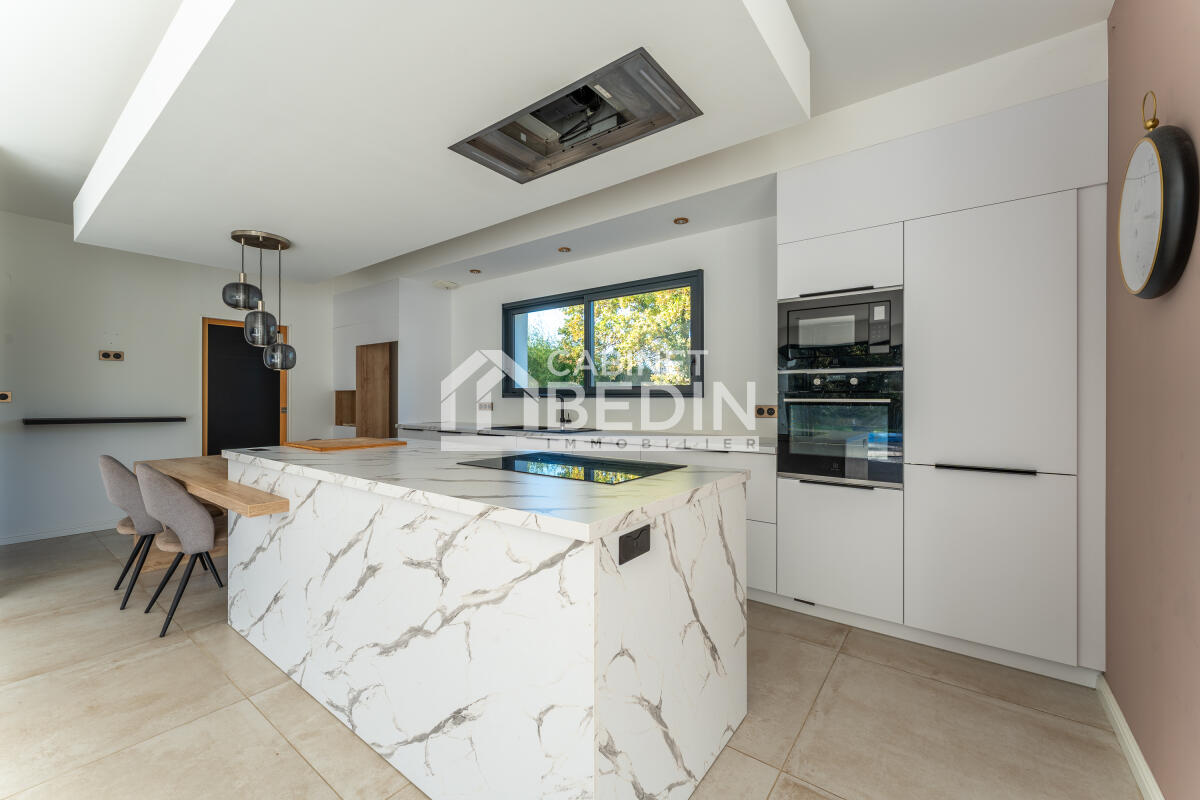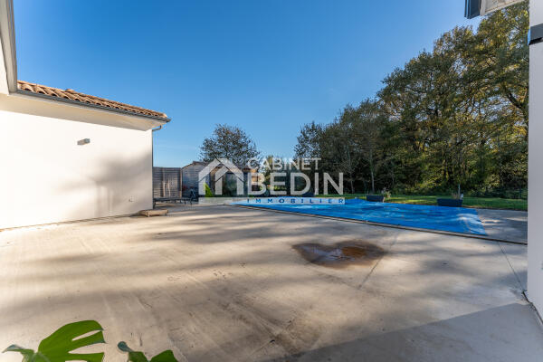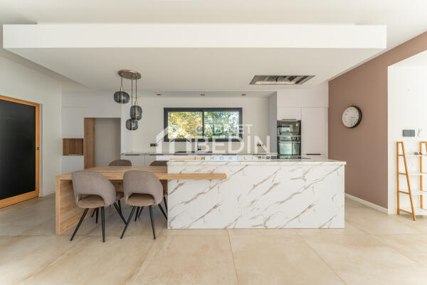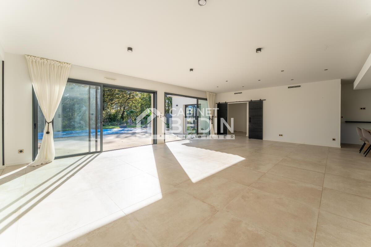 Venez découvrir cette belle maison contemporaine de plain pied encore sous garantie décennale. Située dans un environnement calme et sans vis-à-vis, au fond d'une impasse paisible, elle vous offrira un cadre de vie idéal, entre confort et tranquillité. Vous apprécierez ses volumes généreux, sa luminosité naturelle et son aménagement fonctionnel. Elle dispose d'un vaste espace de vie ouvert sur une terrasse d'environ 120m² et composé d’un salon/séjour et d’une cuisine moderne et équipée. Côté nuit, vous profiterez de 4 chambres dont une suite parentale, d’un bureau ainsi que de 2 salles de douche à l'italienne dont une est équipée d'une baignoire jacuzzi. A l’extérieur, vous apprécierez son jardin d’environ 1400m² et son agréable piscine qui vous permettront de profiter de beaux moments en famille ou entre amis. Un cabanon de jardin et un espace de stationnement complètent cet ensemble.