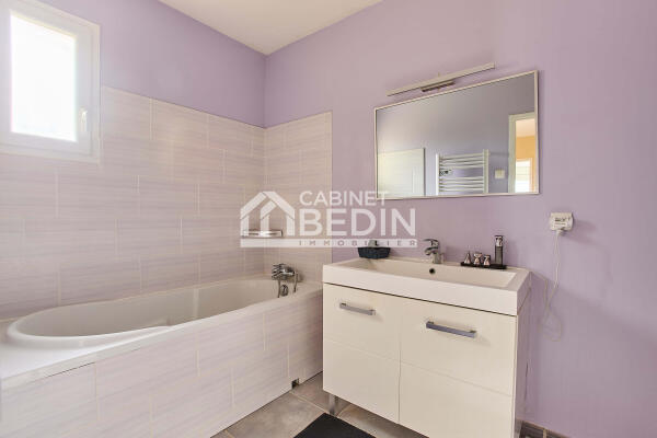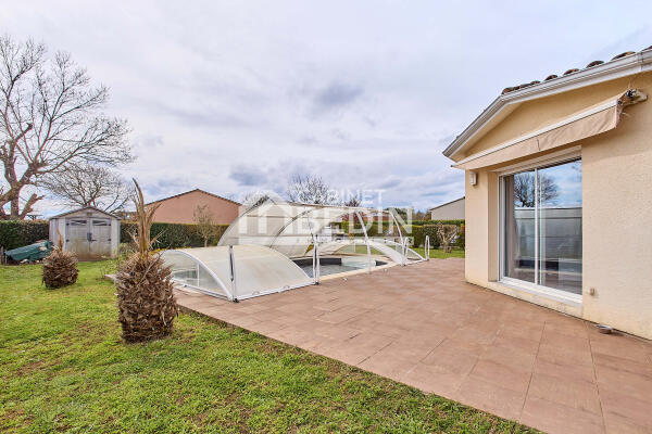 Maison contemporaine de plain pied avec piscine et terrain , située dans un environnement calme, à 5 minutes de la Gare de Cérons et de l’accès autoroute d’Illats.