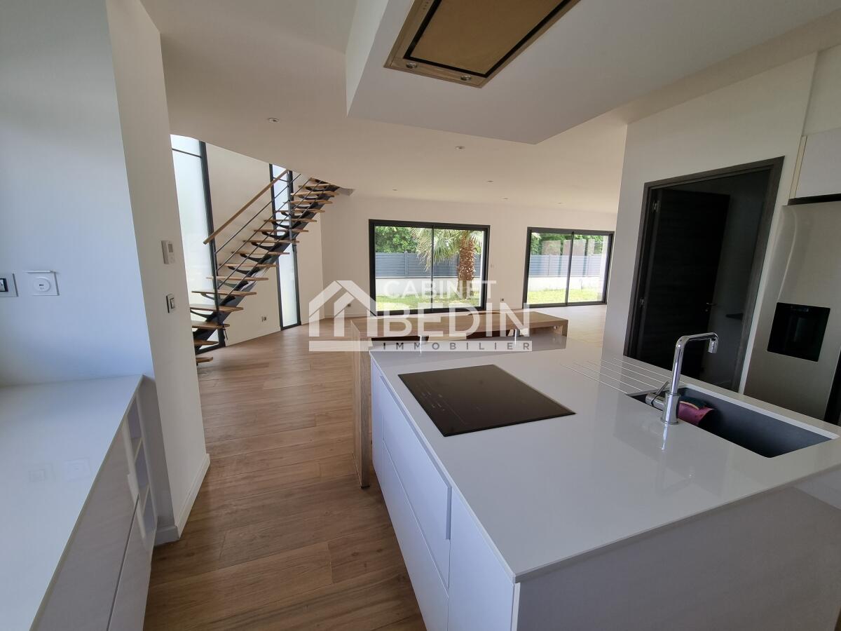 A deux pas des lignes de bus, des commerces et des écoles, cette vaste maison contemporaine s'ouvre largement sur l'extérieur. Très lumineuse, elle a été réalisée aux normes RT2012, avec de beaux matériaux afin d'optimiser ses performances énergétiques. Équipée de domotique, elle dispose entre autres de volets électriques avec commande centralisée, d'un visiophone, d'une pompe à chaleur, de planchers chauffants et d'un chauffe-eau thermodynamique. Le rez-de-chaussée se compose d'une grande pièce à vivre traversante, prolongée par une grande cuisine équipée avec un îlot central. La suite parentale de plain-pied dispose d'une salle de bains et d'un dressing. Au 1er étage, les 4 grandes chambres disposent de balcons et terrasses sur verdure et d'une grande salle de bains avec baignoire et douche italienne. Le jardin calme et clos est arboré. Il est agrémenté d'une grande terrasse qui encadre la piscine au sel. Enfin un grand garage avec une cave complète cette offre. Une maison originale et fonctionnelle à deux pas de la barrière de Bègles, du centre ville de Bordeaux et de la gare Saint Jean.