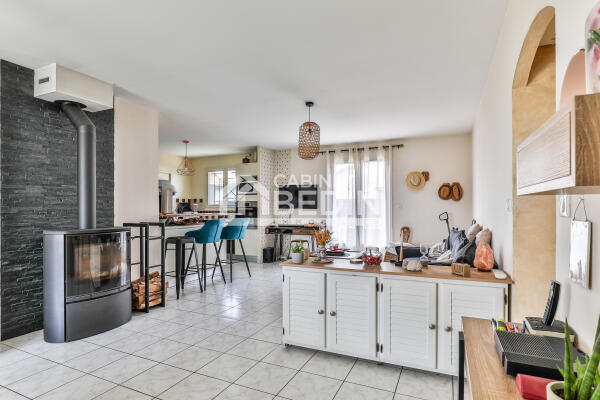 Dès l’entrée, vous apprécierez la belle pièce de vie conviviale, baignée de lumière, avec sa cuisine américaine entièrement équipée, parfaite pour partager des moments en toute convivialité.