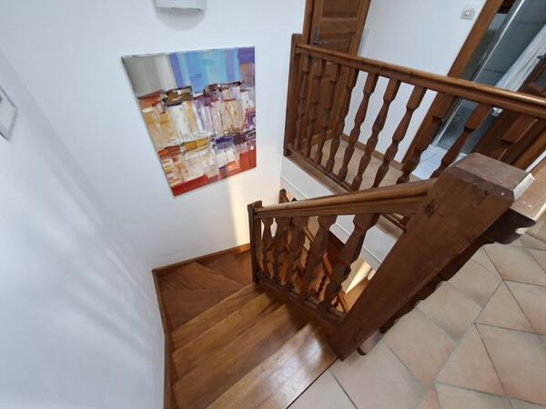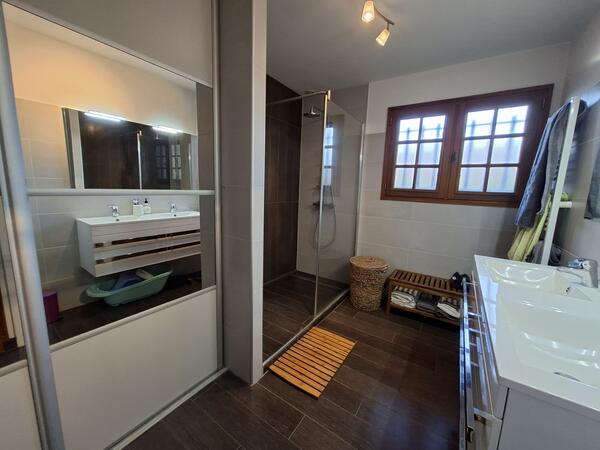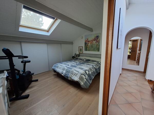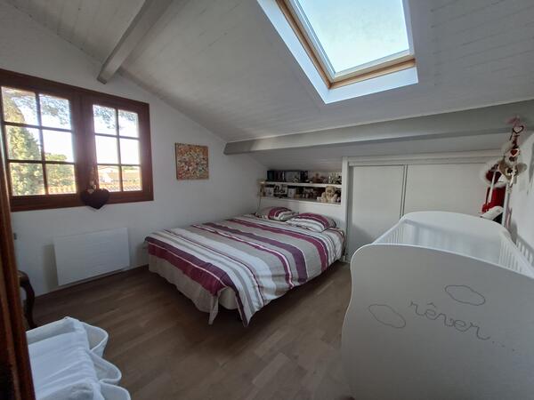 À l’étage, l’espace nuit se compose de trois belles chambres, dont une avec balcon, d’une salle de jeux parfaite pour les enfants, ainsi que d’une salle d’eau avec WC.