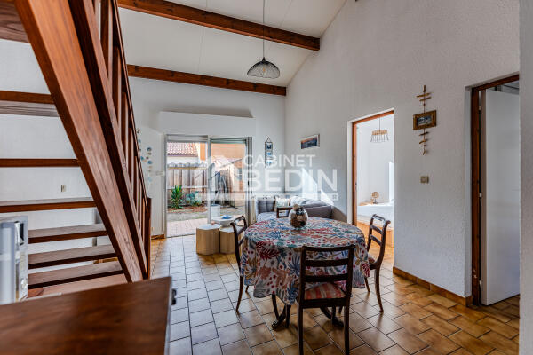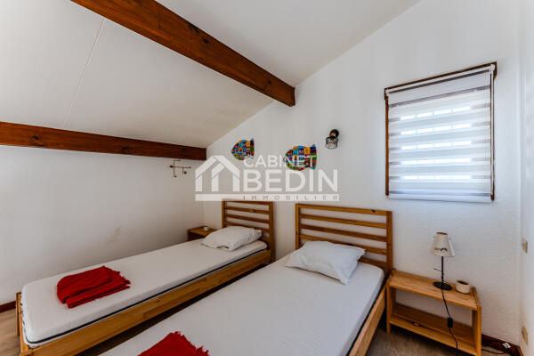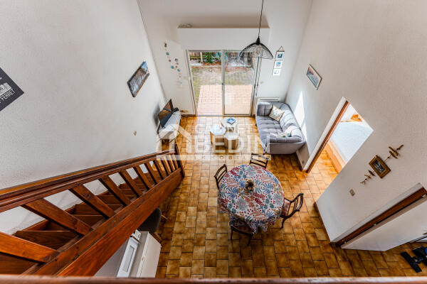 Située dans une petite copropriété de 10 lots, au calme et à proximité immédiate de la plage, cette maison est idéale pour un pied-à-terre ou un investissement locatif. Elle se compose d’un séjour lumineux avec grandes baies vitrées ouvrant sur une terrasse privative d’environ 40 m², d’une cuisine fonctionnelle, de deux chambres de plain-pied, d’une salle d’eau et d’une mezzanine spacieuse permettant d’accueillir plusieurs couchages supplémentaires.