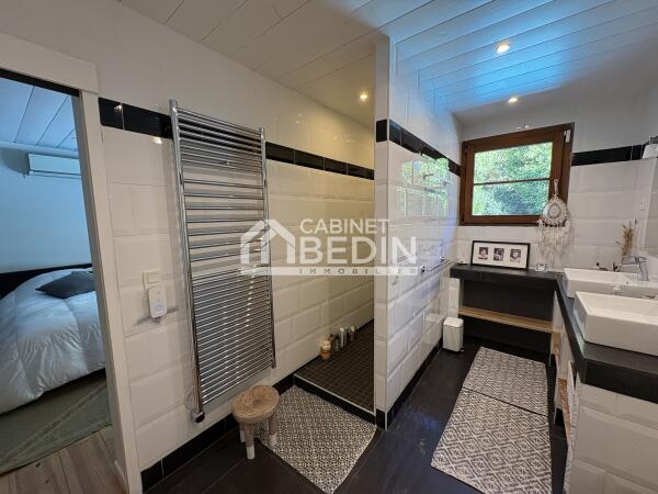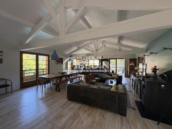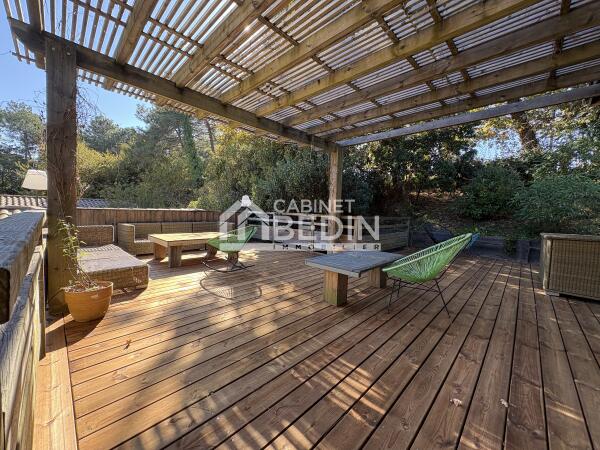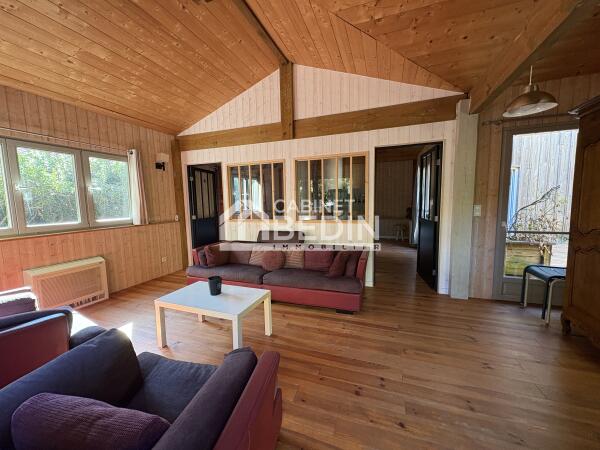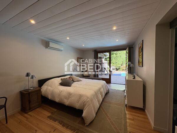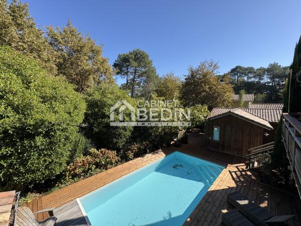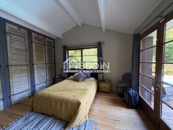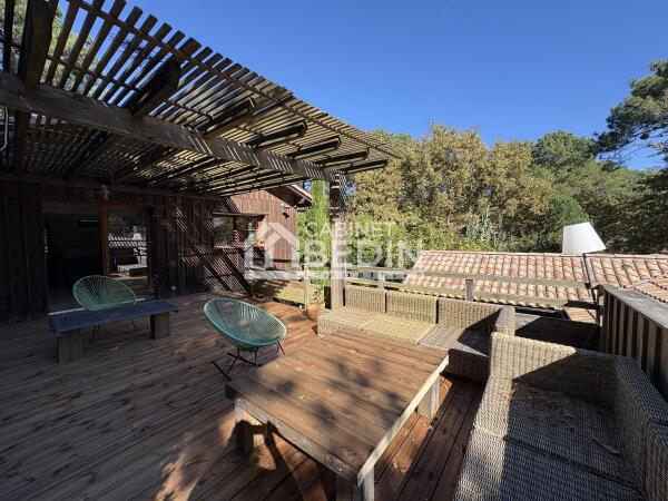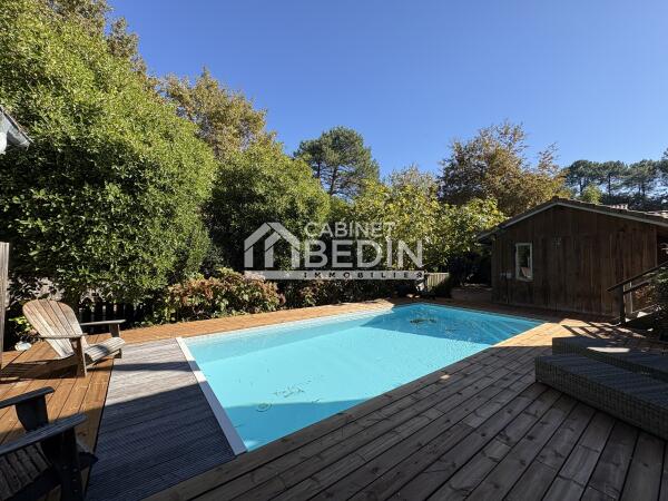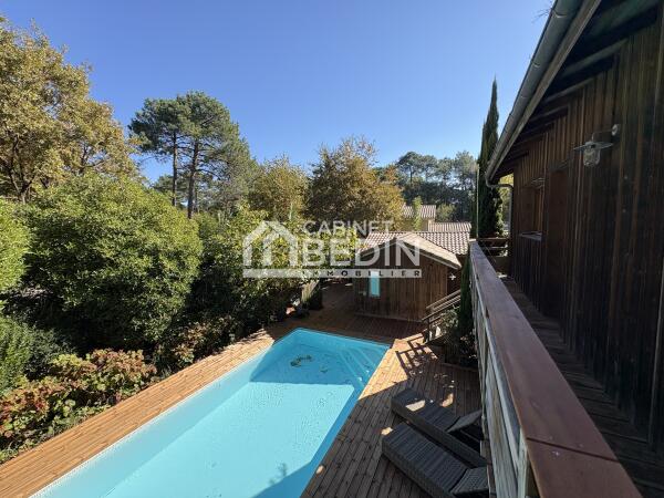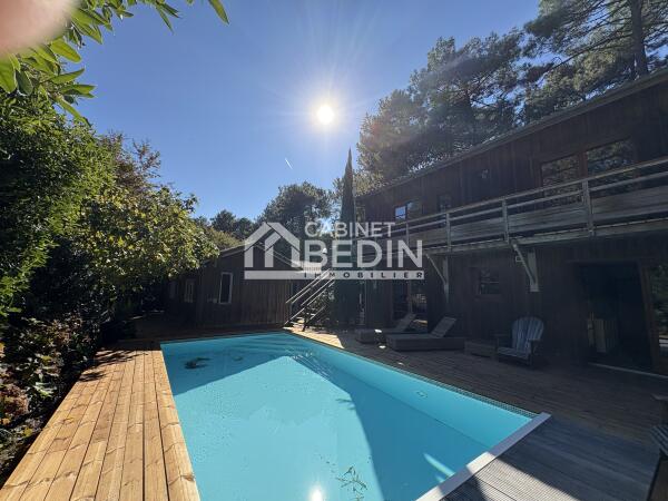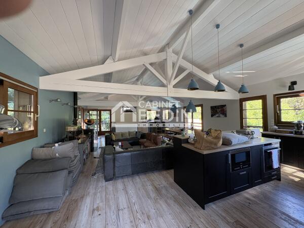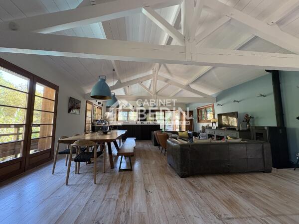 Nichée au sein d'un environnement d'exception, cette villa familiale marie élégance contemporaine et douceur de vivre. Conçue pour le confort et le bien être, elle vous accueille dans un cadre paradisiaque entre forêt de pins et le lac nord de Biscarrosse. Dès l'entrée, le ton est donnée: volumes généreux, finitions raffinées, matériaux nobles. La villa offre deux suites parentales avec salles d'eau privatives, ainsi que deux chambres supplémentaires et une vaste salle d'eau. A l'étage, une pièce de vie spectaculaire baignée de lumière grâce à ses larges baies ouvrant sur les hauteurs des pins et une magnifique terrasse. Son parquet massif et sa cuisine ouverte moderne et fonctionnelle créent un espace chaleureux,convivial et élégant. Atout rare, un appartement indépendant complète la propriété: deux chambres, un séjour, une cuisine et une salle d'eau, parfait pour recevoir en toute intimité ou imaginer un espace dédié à vos envies. A l'extérieur le rêve continue: une piscine chauffée bordée d'une plage en bois et d'un jardin paysagé, un garage à vélo, une buanderie et une cave viennent parfaire ce bien d'exception. Une villa unique, entre nature et élégance, où chaque détail invite à la quiétude et à l'art de vivre...