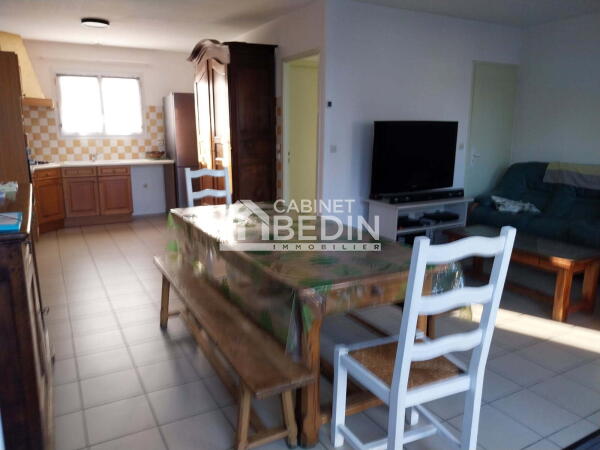 Maison avec terrasse et jardin. Séjour/salon avec cuisine ouverte aménagée et équipée, arrière-cuisine, trois chambres, salle de bains, wc.