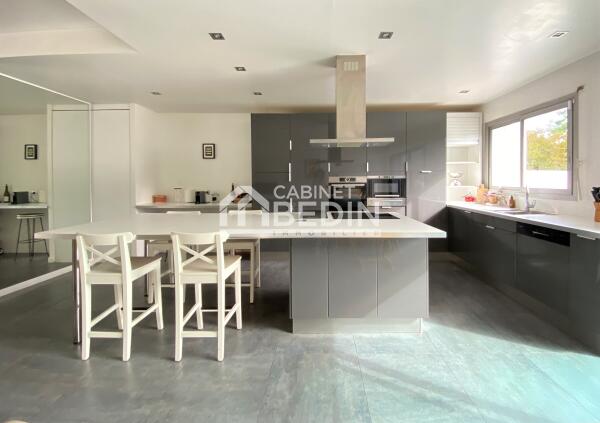Idéale pour une famille, la grande pièce de vie avec cuisine ouverte côté terrasse, vous permettra de profiter, en été, de la piscine et d'un jardin sans vis à vis, en Hiver, d'un espace salon avec cheminée. Le tout complété judicieusement par un espace bureau venant se fondre dans le salon.