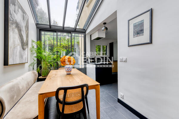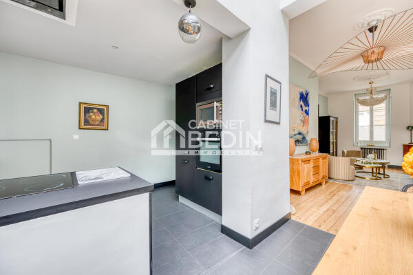 Belle double réception, avec cuisine semi-ouverte, entièrement équipée, donnant toutes deux sur le jardin terrassé et végétalisé, en rez de chaussée.