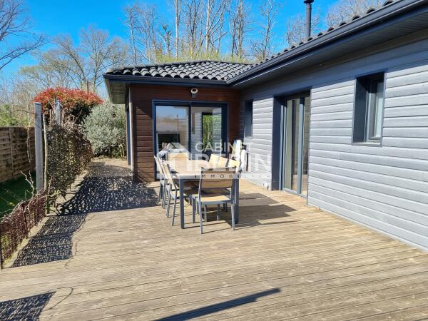 Maison récente de plain-pied avec 4 chambres à Cabanac-et-Villagrains, située dans un hameau calme proche de la forêt. Elle bénéficie d’un jardin paysager, d’une piscine avec terrasse en bois et d’un cadre sans vis-à-vis. Un bien idéal pour un achat immobilier au calme dans la région.