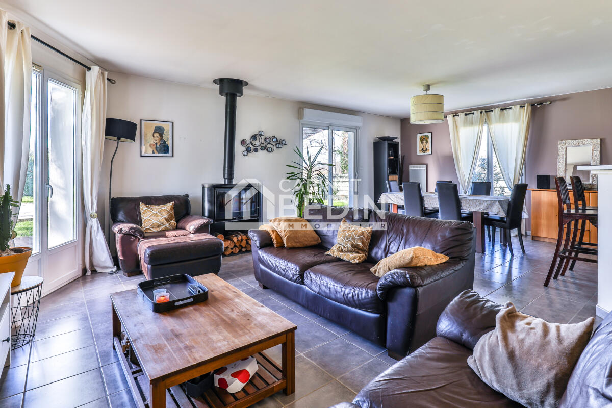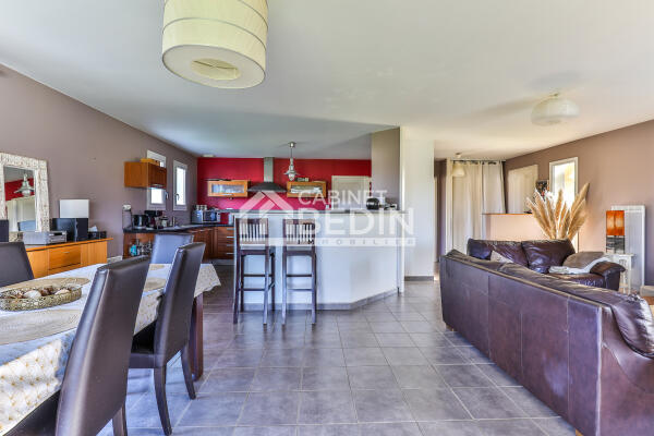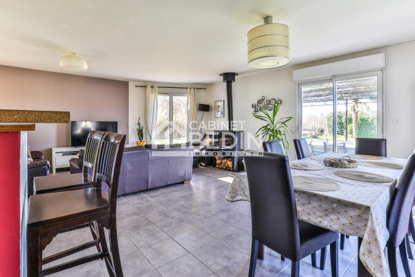 Dès l’entrée, vous serez conquis par la belle luminosité offerte par sa triple exposition, baignant chaque pièce de lumière tout au long de la journée. La maison s’articule autour d’une spacieuse et chaleureuse pièce de vie, où le salon et la salle à manger s’articulent harmonieusement autour d'une cuisine ouverte, aménagée et entièrement équipée. Le poêle à bois apporte une atmosphère cosy, idéale pour les soirées en famille.