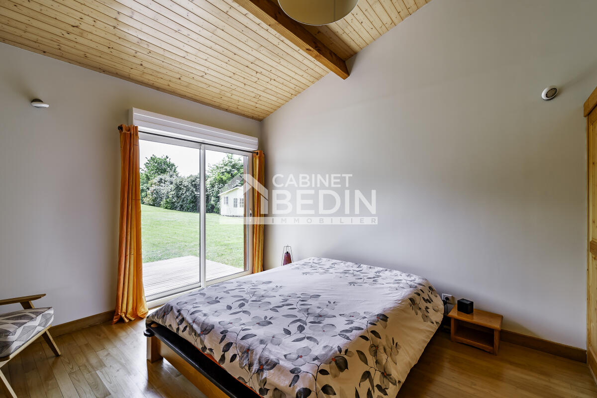 Dans un cadre verdoyant et paisible, proche gare, écoles et commerces, découvrez cette maison ossature bois de grande qualité, sur un terrain plat, arboré et clôturé. Elle offre 5 chambres, dont une indépendante, et 2 salles d'eau, idéale pour tous styles de familles. Chauffage au sol par géothermie, poêle à bois HASE, récupérateur d'eau de pluie de 7 m² alimentant machines à laver, toilettes et robinets extérieurs. Bardage Silverwood, pergola Douglas et parquet châtaignier garantissent un confort quotidien remarquable. À l'extérieur, car-port, garage, cabanon, parking enrobé, potager et arbres fruitiers complètent ce bien rare aux portes de Bordeaux.