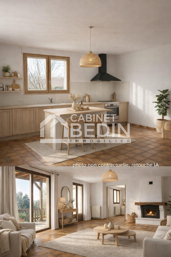La maison propose une distribution fonctionnelle et de beaux volumes, comprenant 4 chambres, un bureau idéal pour le télétravail, ainsi qu’une grande cuisine d’environ 20 m². Le séjour chaleureux est équipé d’une cheminée, apportant confort et convivialité.