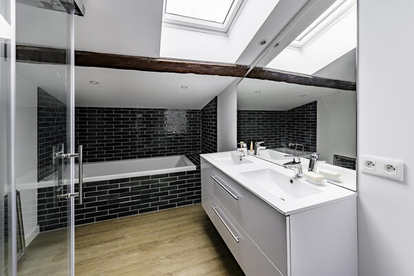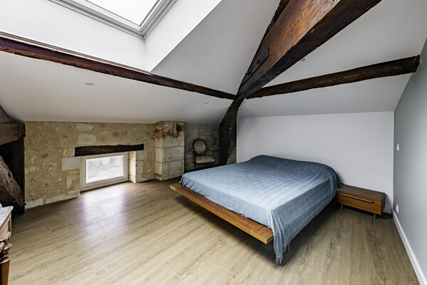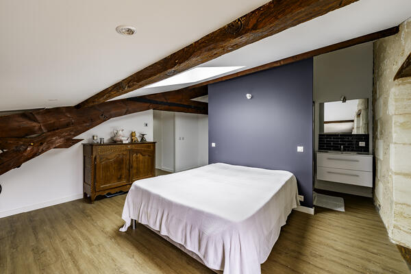 À l’étage, l’espace nuit se compose de trois chambres mansardées, dont une suite parentale de 19 m² avec salle d’eau et dressing. Vous y trouverez également une salle de bains avec baignoire et douche, ainsi qu'un WC indépendant.