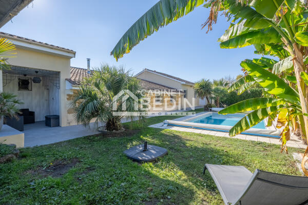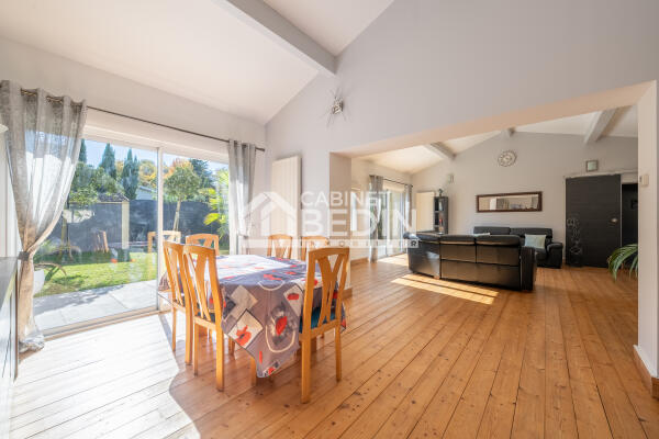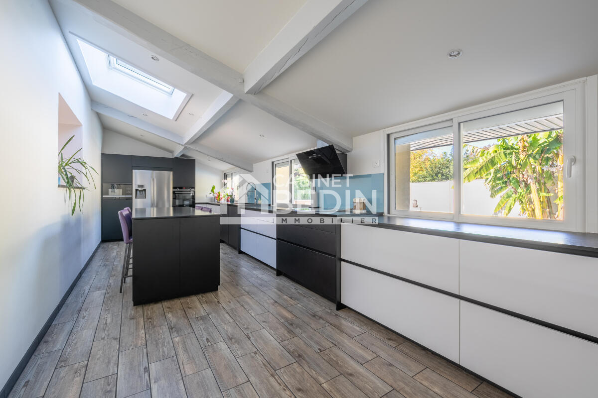 Située à Gradignan, cette maison familiale s'impose par ses volumes généreux. Édifiée en partie en pierre, elle propose un cadre de vie agréable. Dés l'entrée, on est accueilli par un séjour spacieux et lumineux, accompagné d'une cuisine moderne, parfaitement agencée et aux prestations soignées. L'aménagement intérieur a été soigneusement pensé pour préserver l'intimité de chacun, avec la suite parentale à l'opposé des chambres des enfants. Les 4 chambres offrent un confort optimal et une ambiance harmonieuse. Un très grand garage complète ce bien, idéal pour sécuriser deux véhicules ou créer un espace de rangement. Le coup de cœur se confirme avec la piscine parfaitement intégrée à un jardin intime et joliment végétalisé. Cette maison, alliant cachet de la pierre, beaux volumes et agencement réfléchi, constitue un bien rare sur le secteur.