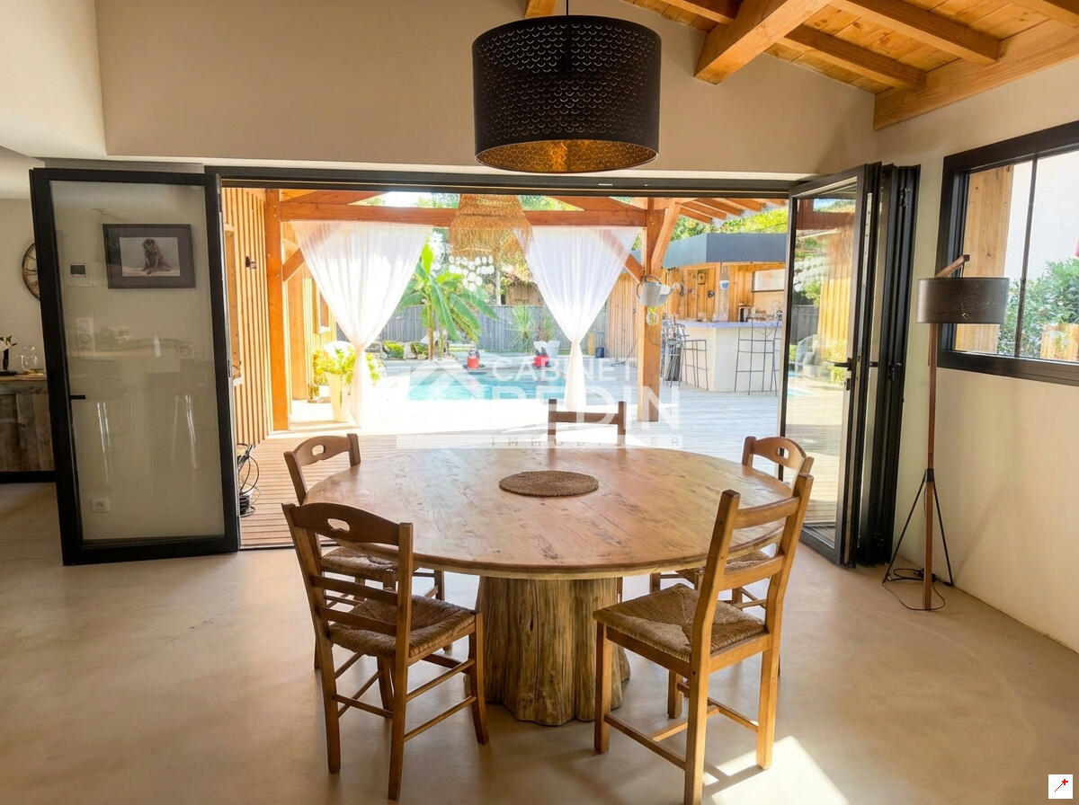 À l’extérieur, le jardin paysagé accueille une piscine au sel, accompagnée de son pool house, offrant un cadre de détente privilégié, propice à la douceur de vivre du Bassin.