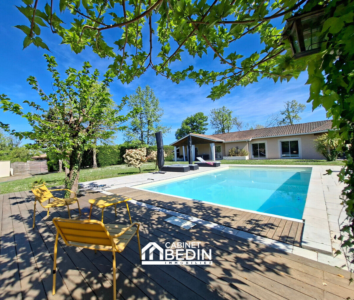 Sur un terrain paysagé de 1 500 m² sans vis-à-vis : piscine chauffée au sel, terrasse bois, pergola et jacuzzi.