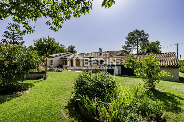 Maison plain-pied à La Lande de Fronsac avec piscine, garage et parking camping-car. Terrain clos arboré de 2120 m², panneaux photovoltaïques, calme assuré.