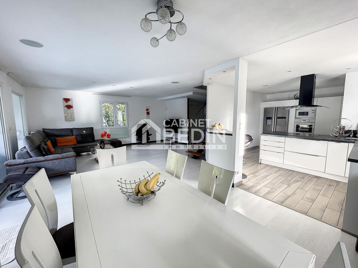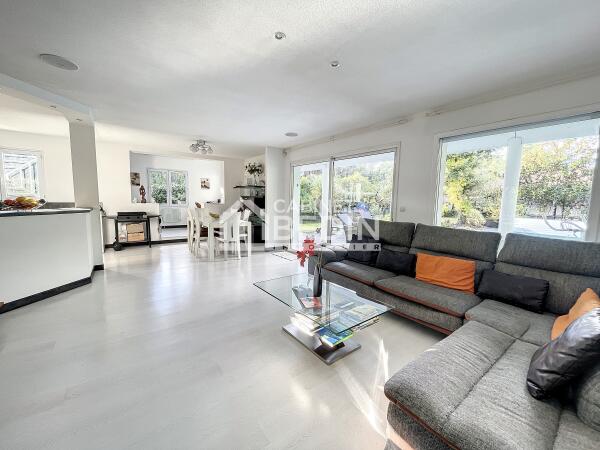 Cette maison familiale offre un salon lumineux, salle à manger, cuisine équipée semi-ouverte, buanderie et bureau.