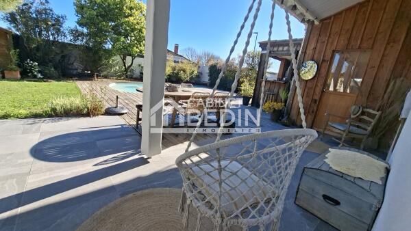 À l’extérieur, la grande terrasse en bois prolonge l’espace de vie et s’ouvre sur un jardin soigné avec piscine, idéal pour profiter du climat du bassin d’Arcachon. Un cabanon de rangement complète les équipements.