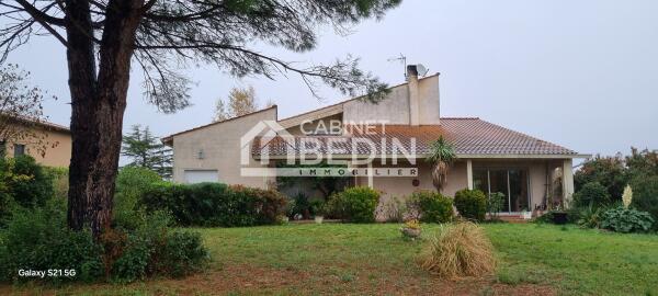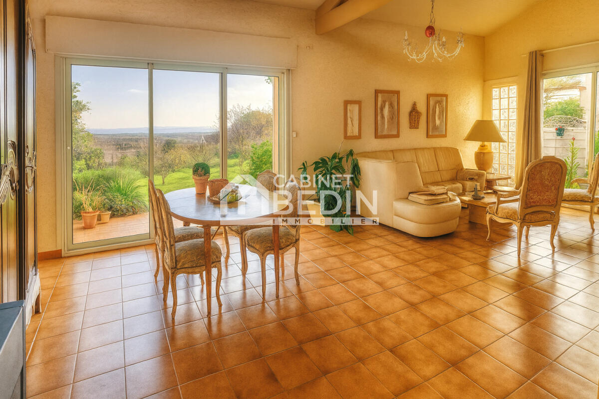 À l’extérieur, une large terrasse plein Sud s’ouvre sur les Pyrénées, tandis que le terrain généreusement arboré permet l’implantation aisée d’une piscine, renforçant encore l’attrait de cette propriété familiale.