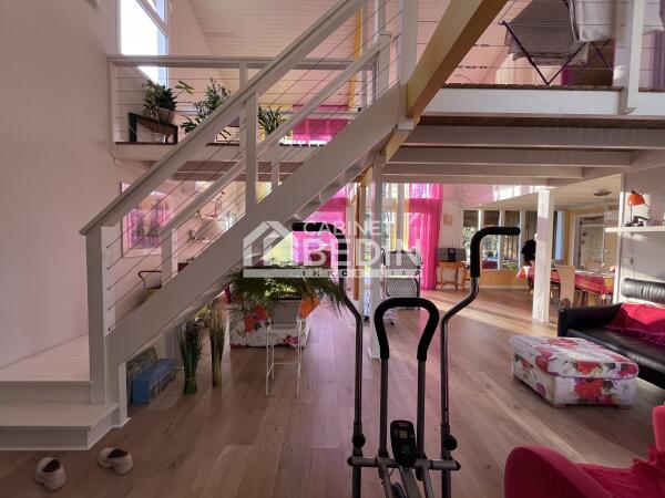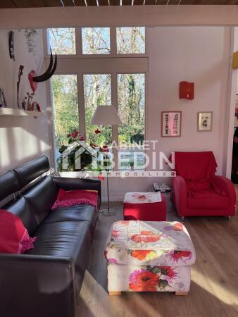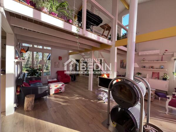 Nichée sur une parcelle de 4000 m², cette maison d'architecte en bois séduit par ses volumes généreux et sa luminosité exceptionnelle. Un véritable havre de paix pour ceux qui recherchent à la fois calme et grands espaces, elle offre un cadre de vie incomparable. Dès l'entrée, vous serez accueilli par un vaste séjour-cuisine de près de 70 m², surplombé par un plafond cathédrale qui s'ouvre sur un jardin verdoyant. L'agencement intérieur est parfaitement pensé : une suite parentale avec salle d’eau, toilettes et dressing, ainsi que trois autres chambres dotées de nombreux rangements. Le rez-de-chaussée comprend également un cellier, une buanderie et des toilettes séparées.