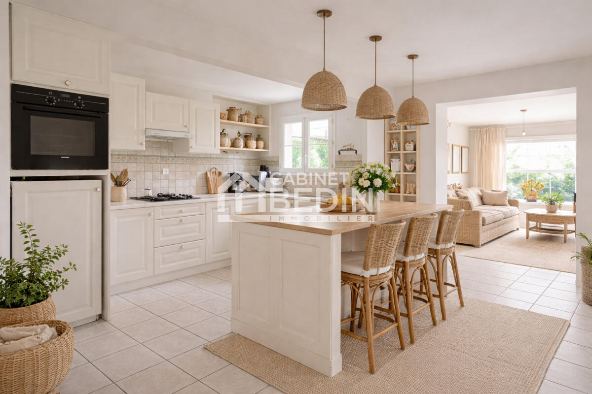 Le séjour lumineux constitue un véritable espace de vie convivial, prolongé par une véranda chauffée avec vue dégagée sur le jardin. La cuisine indépendante équipée apporte confort et praticité au quotidien.