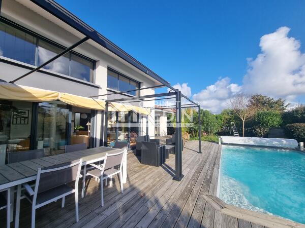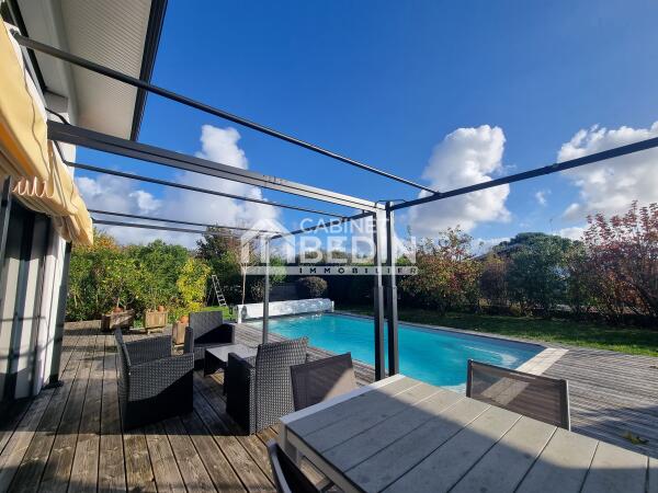 À l’extérieur, vous profiterez d’un espace soigneusement aménagé comprenant une piscine, une belle terrasse, une pergola et un jardin entretenu, parfait pour les moments de détente. Un garage vient compléter les prestations.