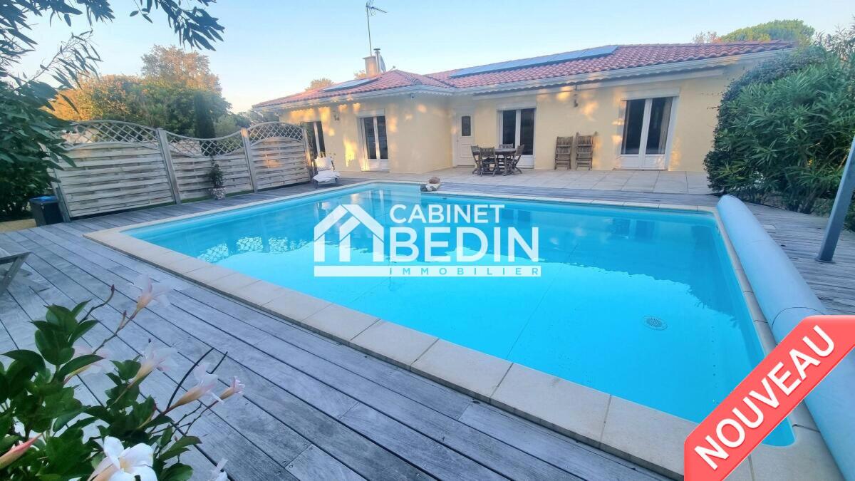 Maison plain-pied à Lège-Cap-Ferret, 3 chambres, piscine au sel, jardin de 870 m², panneaux photovoltaïques. Proche commerces, écoles, océan et forêt.