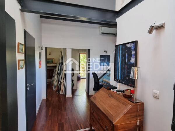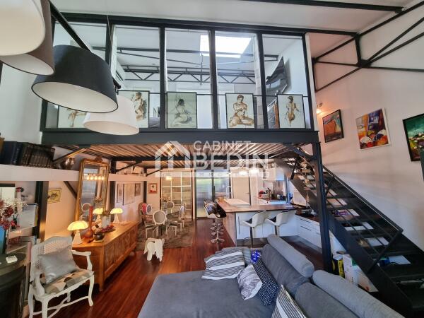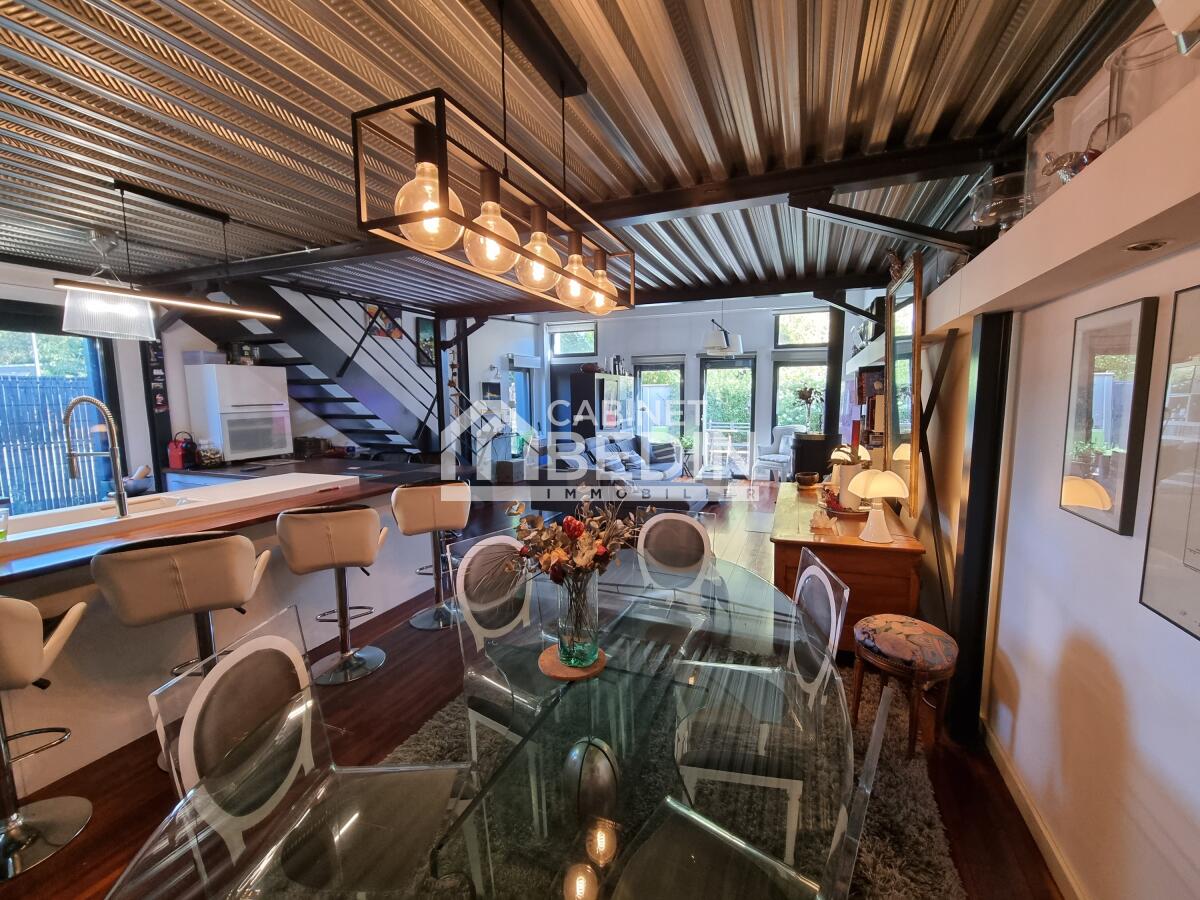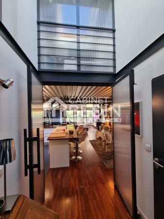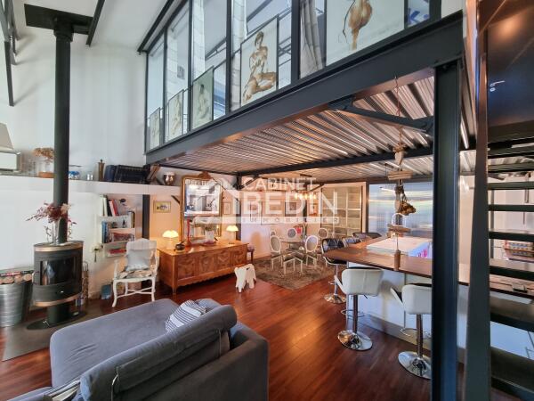 A deux pas du tram A (direction Bordeaux/Aéroport de Mérignac) au calme d'une petite copropriété sécurisée, ce loft a été réalisé dans le pur style industriel. Il comprend un vaste séjour cathédrale avec poêle à bois et climatisation, structuré par une alliance parfaite du verre et du métal. La pièce de vie est surplombée par une suite parentale en verrière qui dispose de sa salle d'eau et de son dressing. La cuisine américaine est équipée (plaque, four, hotte, cave à vin...) et elle dispose d'un cellier/buanderie. Le rez-de-chaussée comprend également deux chambres qui s'ouvrent sur une terrasse. Une salle de bains aménagée avec baignoire et douche, ainsi qu’un bel espace bureau dans le style "atelier d'artiste". La petite copropriété comprend également une piscine chauffée de 8x4 et une salle de gym équipée avec douche et sauna. Enfin le bien dispose de deux places de parking, dont une "boxable" qui est équipée d'une prise électrique. Vous serez séduit par cet original loft qui allie style et fonctionnalité, aux portes de Bordeaux!