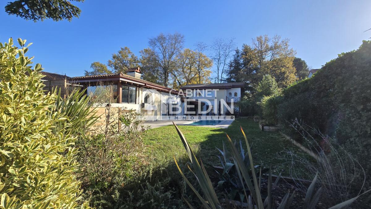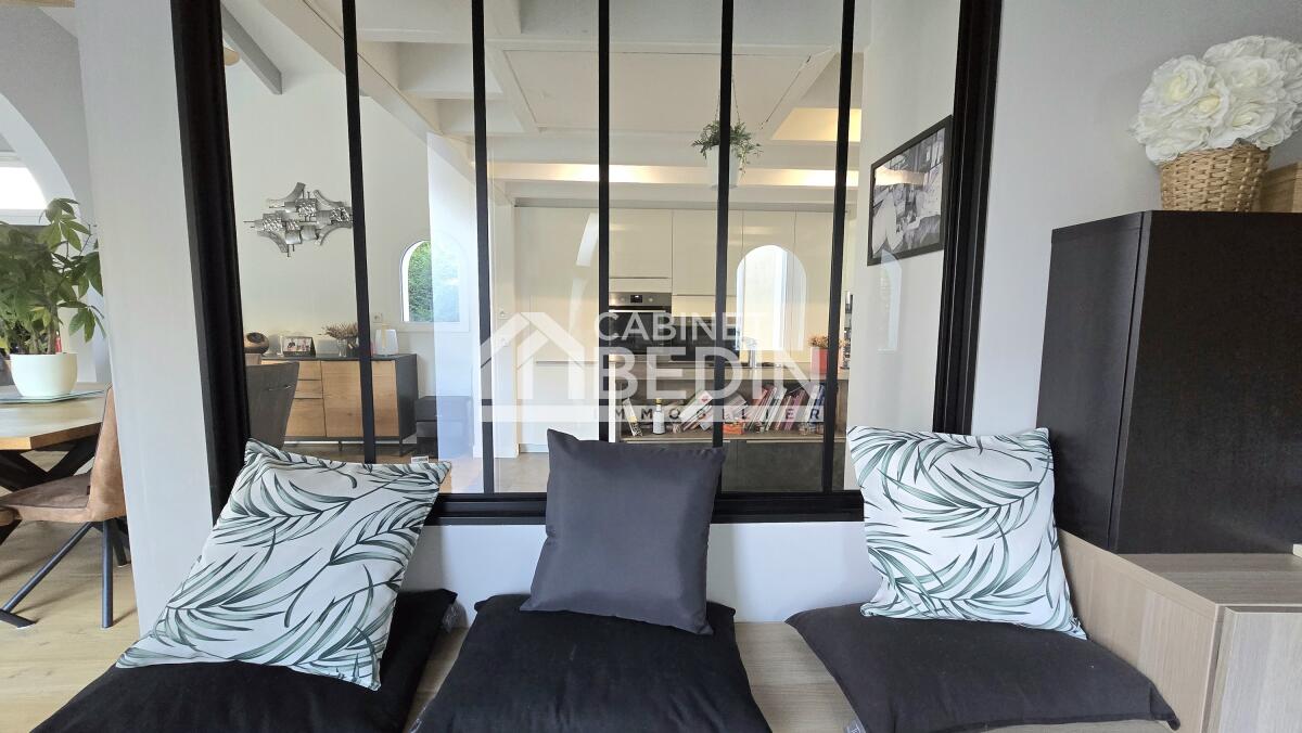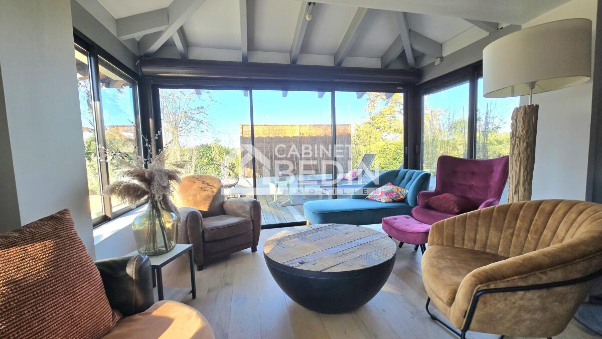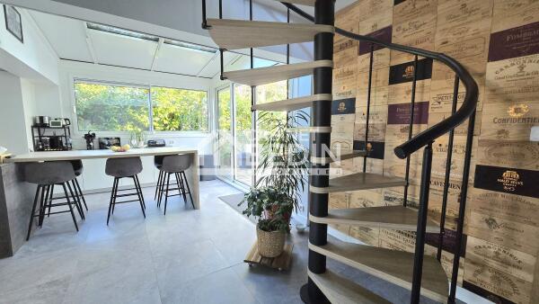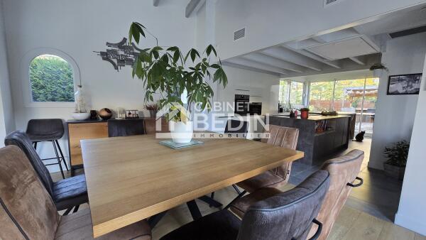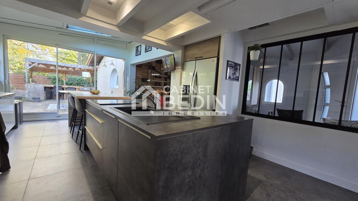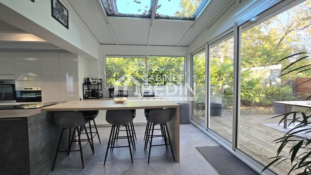 Volume, Luminosité et beaucoup de charme pour cette maison d'architecte entièrement rénovée proche du centre de Mérignac et à quelques pas du Tramway. Celle-ci se compose en rez-de-chaussée d'un spacieux salon- séjour, d'une cuisine aménagée et équipée donnant sur une véranda isolée et un espace extérieur avec sa cuisine d'été, deux chambres avec dressing dont une donnant sur la magnifique terrasse et sa piscine au sel chauffée, un bureau avec accès au Solarium, une salle de bains, une buanderie et un wc. A l'étage deux grande chambres, un bureau, une salle d'eau et un wc.