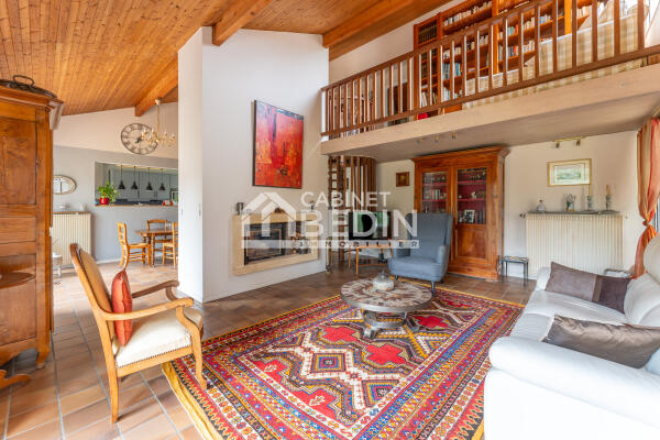 À l’étage, une grande mezzanine surplombant le séjour offre un espace ouvert et lumineux, desservant deux chambres supplémentaires et une salle d’eau.