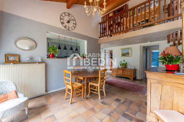 Le rez-de-chaussée comprend une cuisine, un vaste salon-séjour à la hauteur cathédrale, exposé sud-ouest, ouvrant sur le jardin arrière et agrémenté d’une grande cheminée avec insert, créant une ambiance chaleureuse et conviviale. Une véranda baignée de lumière complète harmonieusement les espaces de vie. Ce niveau dispose également d’un cellier, de trois chambres spacieuses, dont une suite parentale avec salle de bain attenante, ainsi qu’une seconde salle d’eau.