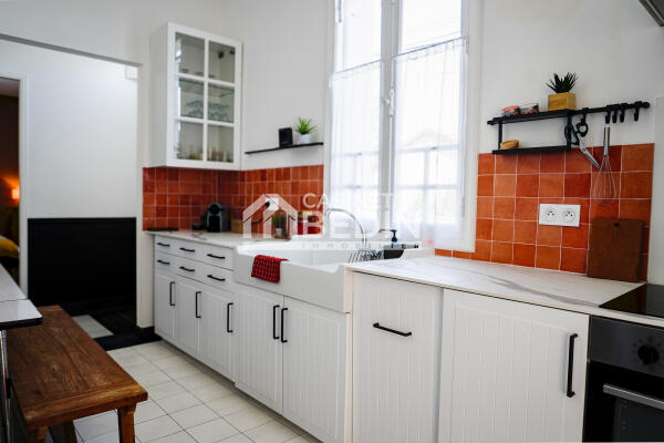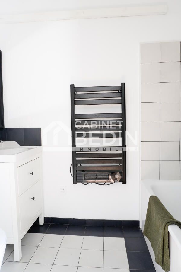Les pièces d’eau ont été entièrement refaites à neuf, avec une salle de bain intégrée à la suite parentale (baignoire), et une salle d’eau avec douche dédiée aux deux autres chambres. Le tout est équipé de vasques élégantes, robinetterie en faïence et laiton, pour une touche vintage chic parfaitement en harmonie avec le style de la maison.