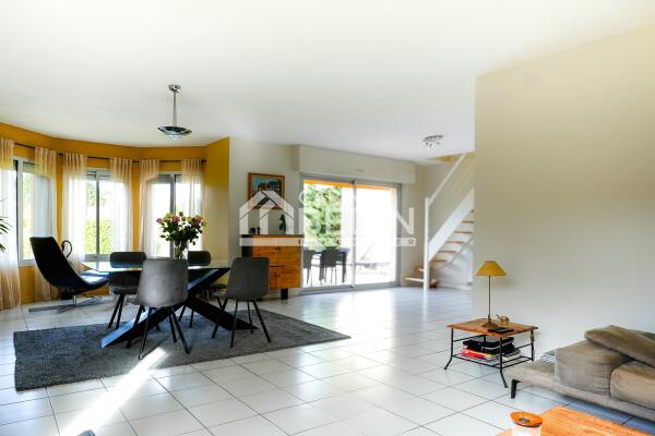 L’intérieur se distingue par un vaste espace de vie de 58 m², baigné de lumière grâce à de larges baies vitrées ouvrant sur le jardin. Le salon et la salle à manger forment un lieu convivial, idéal pour recevoir. La cuisine, moderne et fonctionnelle, bénéficie d’un accès direct à une buanderie menant au garage. Côté nuit, la villa dispose de 4 chambres spacieuses, dont une suite parentale avec salle de bain privée, dressing et boudoir pouvant se transformer en 5ème chambre.