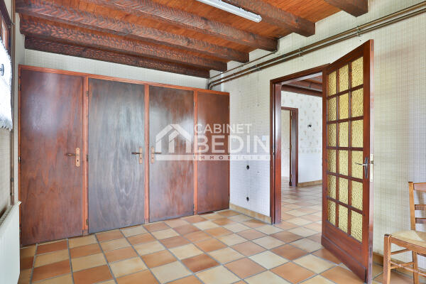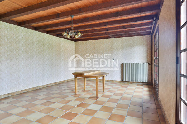 Maison de plain pied sur terrain de 1800 m² composée d'un salon, salle à manger, cuisine, 3 chambres, buanderie, véranda, salle d'eau et garage de 40 m²