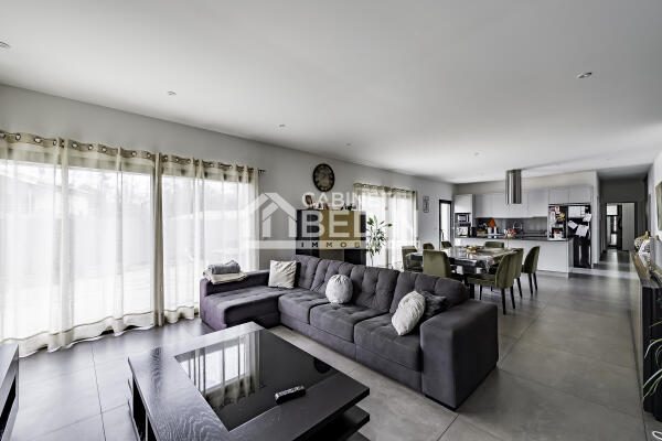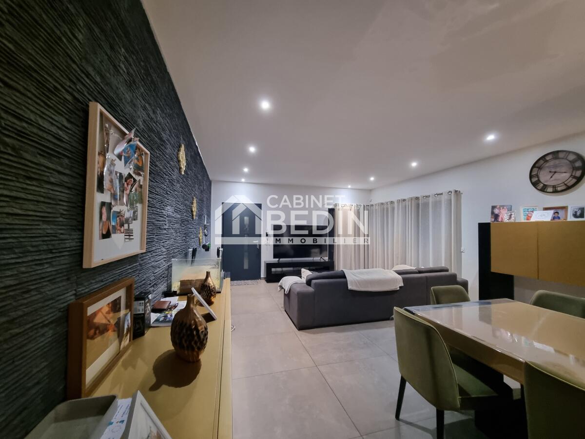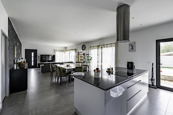 Cette maison contemporaine de plain-pied à Sadirac offre environ 142 m² habitables sur un terrain paysager de 827 m². Elle comprend un séjour lumineux avec 2,80 m de hauteur sous plafond, une cuisine ouverte, plusieurs chambres dont une suite parentale, ainsi qu'une terrasse en bois et une piscine au sel avec couverture coulissante. Située au calme, proche de Bordeaux, elle bénéficie d'équipements modernes comme le chauffage au sol par pompe à chaleur et la domotique DELTADORE. Ce bien représente une belle opportunité d'achat immobilier à Sadirac, alliant confort et tranquillité dans un secteur recherché. Cabinet Bedin Immobilier vous accompagne dans votre projet immobilier à Sadirac.
