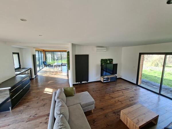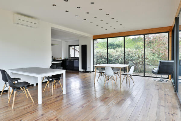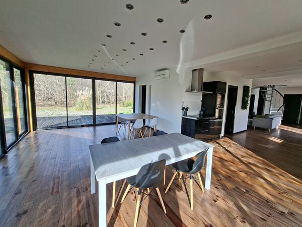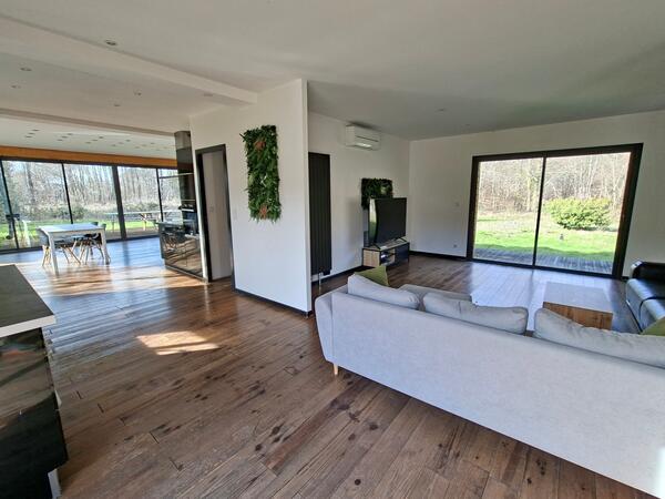 Dans un cadre privilégié, au calme proche des plages et port du lac, cette superbe maison séduit par son environnement verdoyant avec son vaste terrain de plus de 2000m² en lisière de forêt. Dés l’entrée, vous serez charmé par ses grands espaces baignés de lumière : un vaste séjour/salle à manger avec triple exposition, une cuisine ouverte moderne et un salon confortable offrant une atmosphère conviviale. Son parquet massif apporte chaleur et caractère à l’ensemble. Côté nuit, la maison propose en rez-de-chaussée deux chambres avec dressing et une salle d’eau. A l’étage, une grande pièce pouvant être aménageable en fonction des envies. Bien rare alliant confort, luminosité et qualité de vie. A découvrir sans tarder.